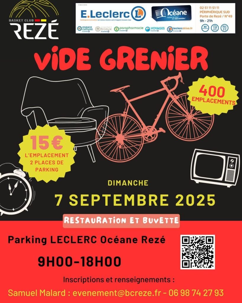 Vous cherchez des trésors cachés à petits prix ? Ne manquez pas le vide-grenier du Basket Club Rezé qui se tiendra le dimanche 7 septembre 2025 de 9h00 à 18h00 sur le parking du Leclerc Océane. ![]()